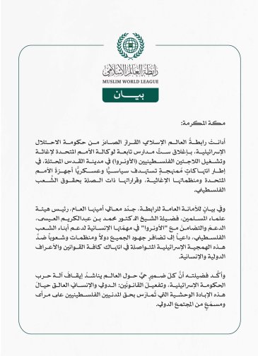 أدانت رابطة العالم الإسلامي، استهداف قواتِ حكومة الاحتلال الإسرائيلي مستودعاً تابعاً للمركز السعودي للثقافة والتراث، شرقي رفح، مما أدى إلى تدميره بما يحتويه من مستلزماتٍ طبيةٍ كانت مخصصة لتلبية احتياجات المرضى والمصابين في قطاع غزة، إضافةً إلى استهداف "مدرسة دار الأرقم" التي تؤوي النازحين في غزة، مما أدى إلى عشرات الضحايا والإصابات.