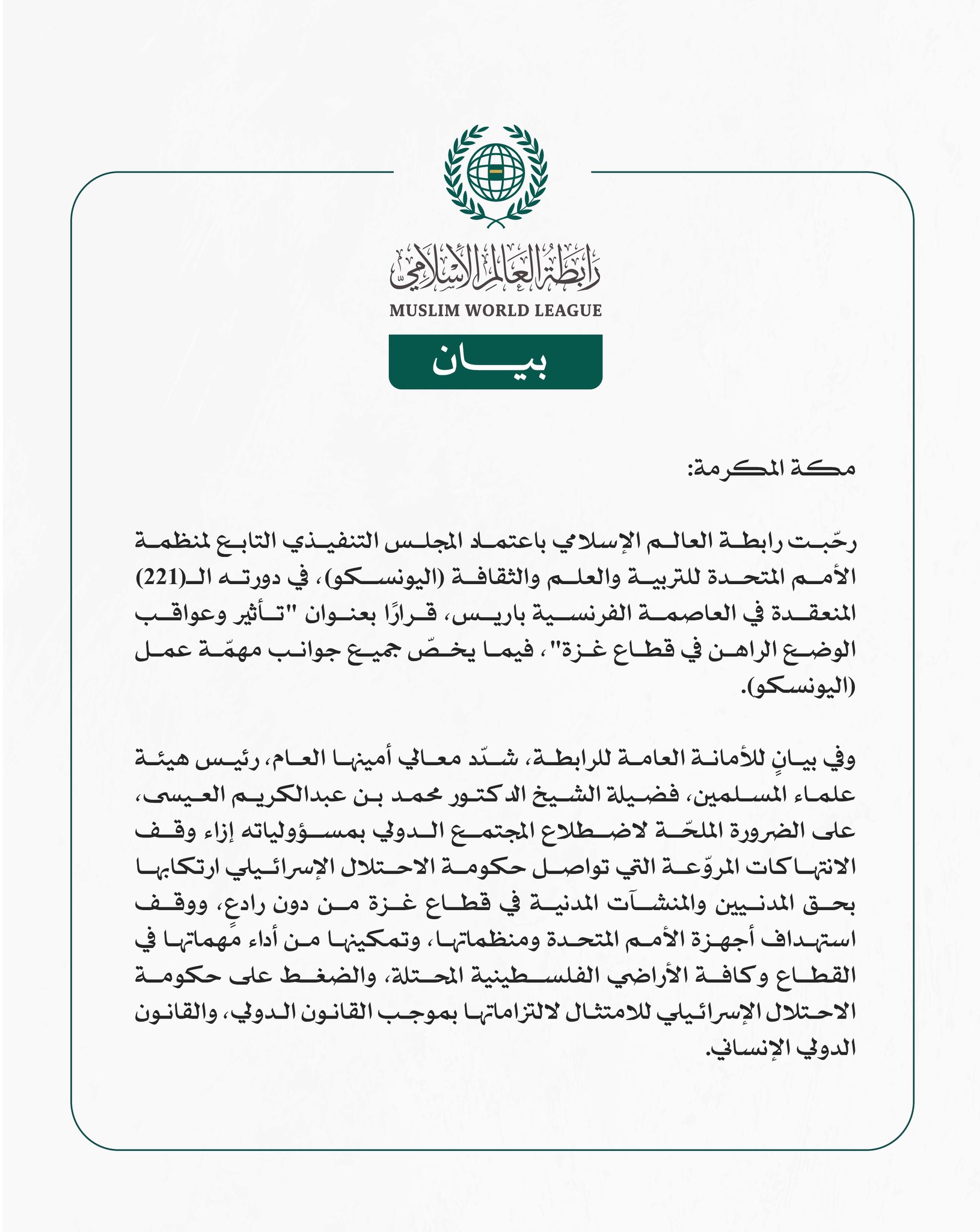 رحّبت رابطة العالم الإسلامي باعتماد المجلس التنفيذي التابع لمنظمة الأمم المتحدة للتربية والعلم والثقافة (اليونسكو)، في دورته الـ(221) المنعقدة في العاصمة الفرنسية باريس، قرارًا بعنوان "تأثير وعواقب الوضع الراهن في قطاع غزة"، فيما يخصّ جميع جوانب مهمّة عمل (اليونسكو).
