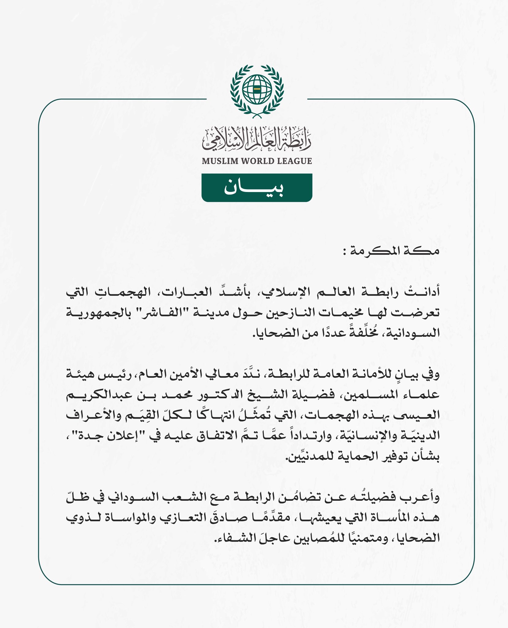 أدانتْ رابطة العالم الإسلامي، بأشدِّ العبارات، الهجماتِ التي تعرضت لها مخيمات النازحين حول مدينة "الفاشر" بالجمهورية السودانية، مُخلِّفةً عددًا من الضحايا.