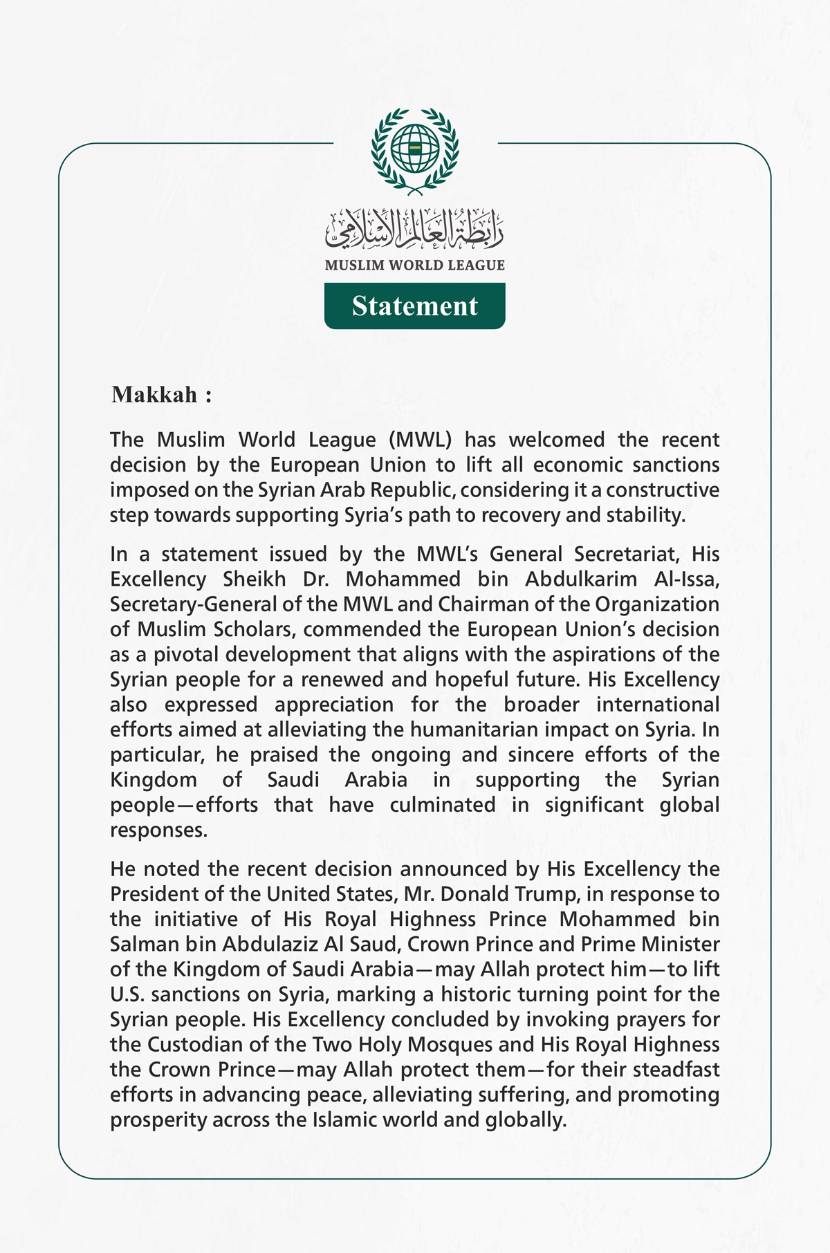 The Muslim World League (MWL) has welcomed the recent decision by the European Union to lift all economic sanctions imposed on the Syrian Arab Republic, considering it a constructive step towards supporting Syria’s path to recovery and stability.