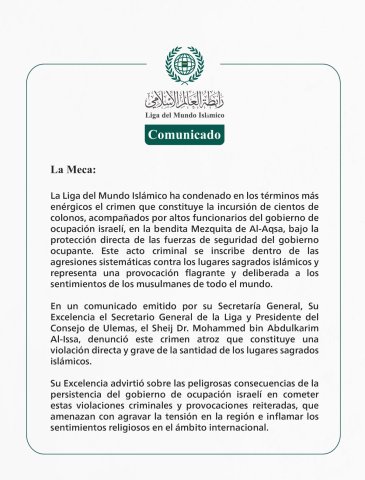 En un comunicado emitido por la Secretaría General de la Liga, el Secretario General y Presidente del Consejo de Ulemas, el Sheij Mohammad bin Abdulkarim Al-Issa, denunció la política persistente del gobierno de ocupación israelí, que ignora los derechos del pueblo palestino, su humanidad y dignidad, además de sus continuas violaciones de todas las leyes y normas internacionales y humanitarias en los territorios palestinos ocupados.