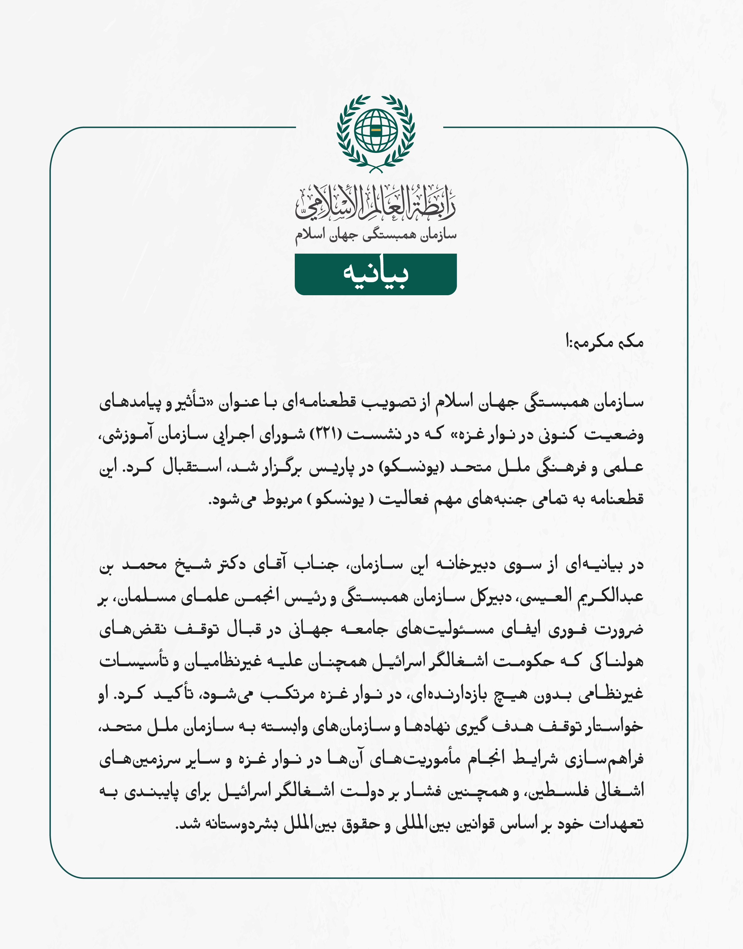 بيانیه سازمان همبستگی جهان اسلام : یک‌شنبه, 13 آوریل 2025 - 09:30