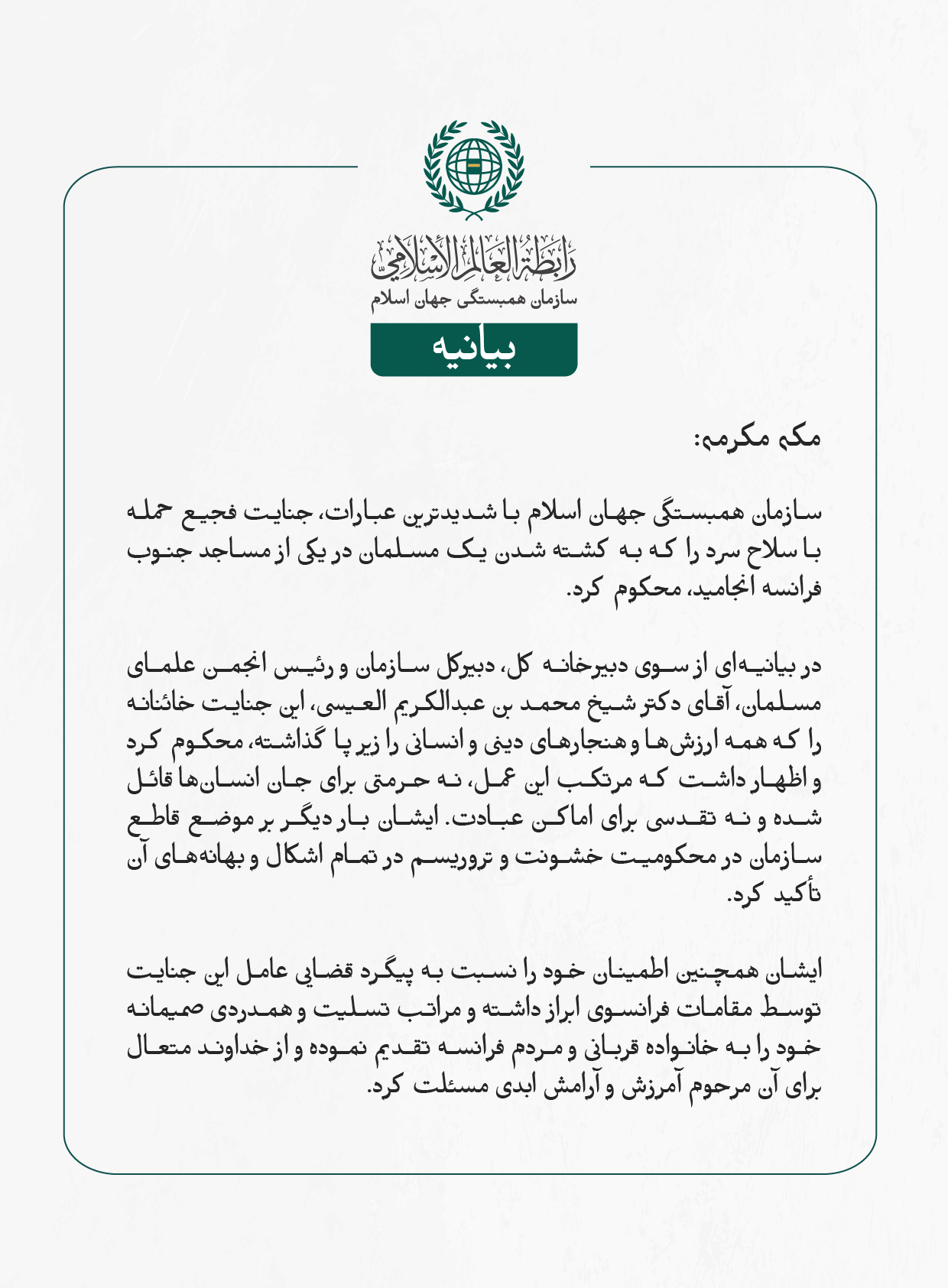 سازمان همبستگی جهان اسلام با شدیدترین عبارات، جنایت فجیع حمله با سلاح سرد را که به کشته شدن یک مسلمان در یکی از مساجد جنوب فرانسه انجامید، محکوم کرد.