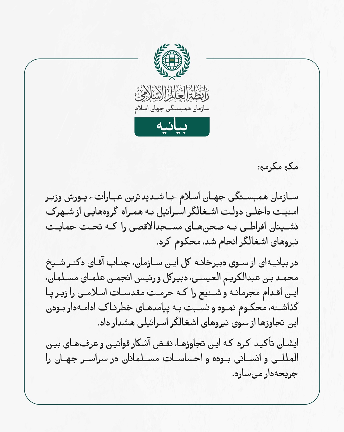 در بیانیهای از سوی دبیرخانه کل این سازمان، جناب آقای دکتر شیخ محمد بن عبدالكريم العيسى، دبیرکل و رئیس انجمن علمای مسلمان، این اقدام مجرمانه و شنیع را که حرمت مقدسات اسلامی را زیر پا گذاشته، محکوم نمود و نسبت به پیامدهای خطرناک ادامهدار بودن این تجاوزها از سوی نیروهای اشغالگر اسرائیلی هشدار داد.