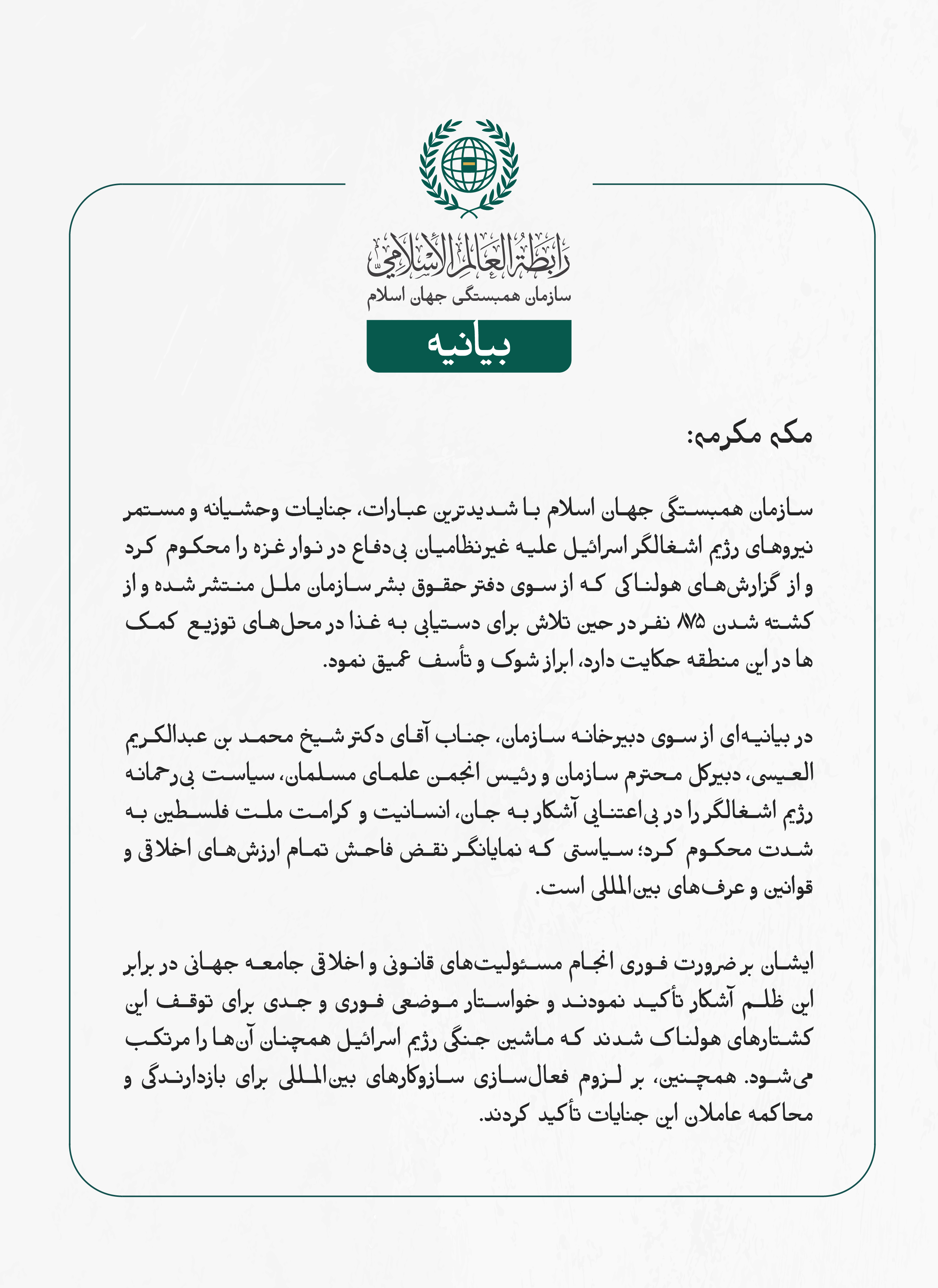 بيانیه سازمان همبستگی جهان اسلام : پنج‌شنبه, 17 ژوئیه 2025 - 11:45