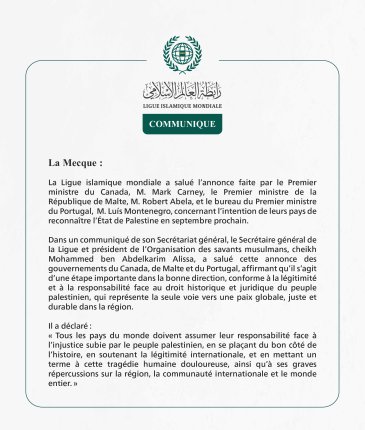 La Ligue islamique mondiale a fermement condamné le bombardement par les forces d'occupation israéliennes de l'école "Al-Tabi'in", qui abrite des déplacés dans le quartier d'Al-Daraj, à l'est de la ville de Gaza, ce qui a entraîné la mort de centaines de personnes et blessé des dizaines d'autres.
