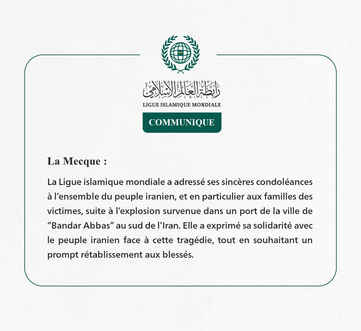 La Ligue islamique mondiale présente ses condoléances au peuple iranien pour les victimes de l’explosion dans la ville de “Bandar Abbas”