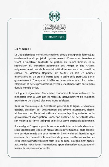 La Ligue islamique mondiale a condamné les agressions israéliennes contre la République islamique d’Iran, soulignant la gravité des violations de la souveraineté des États et du droit international, ainsi que les répercussions de ces actes sur la paix et la sécurité internationales.