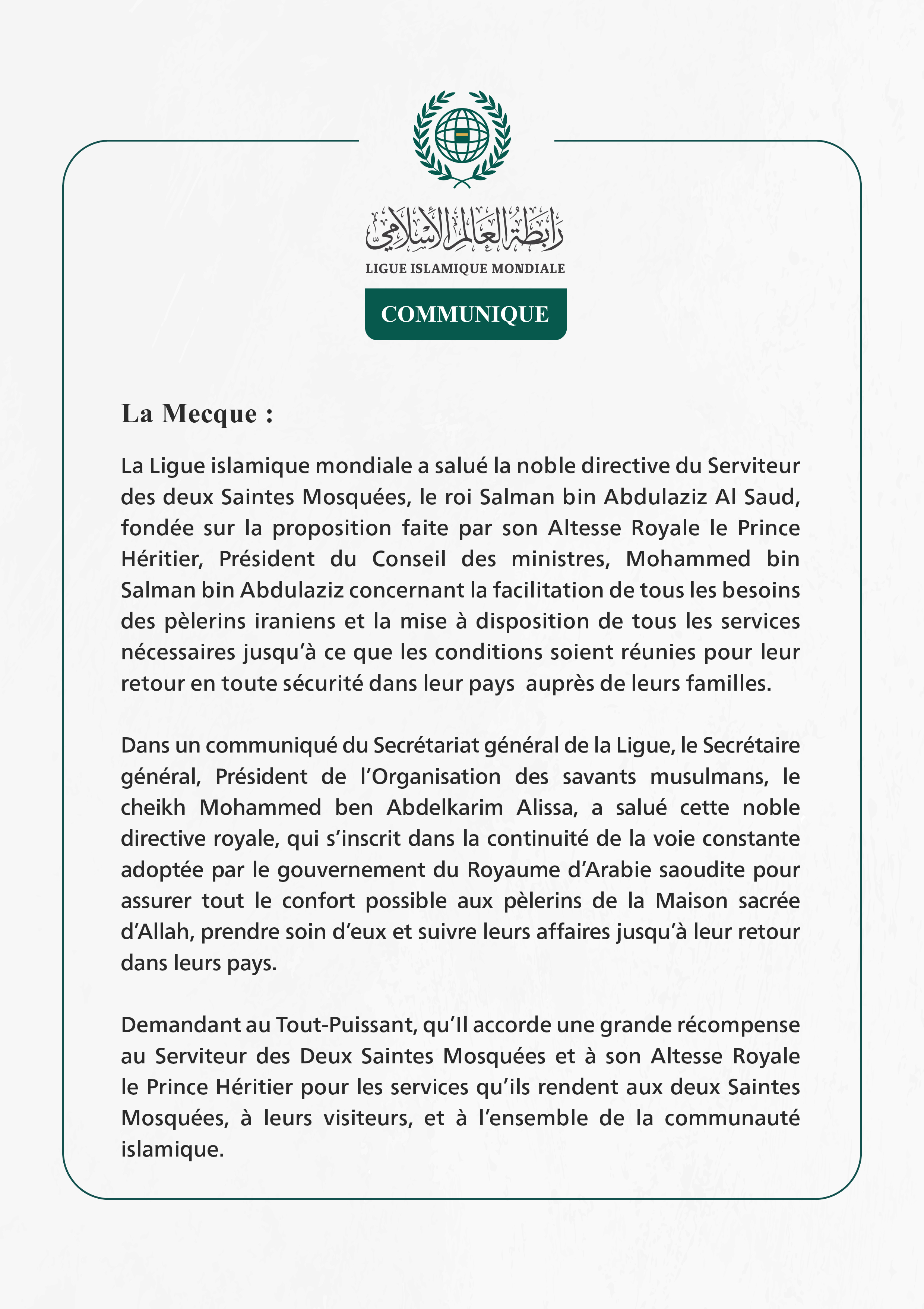 La Ligue islamique mondiale salue la directive du Serviteur des deux Saintes Mosquées visant à répondre à tous les besoins des pèlerins iraniens jusqu’à ce que les conditions soient réunies pour leur retour au pays.