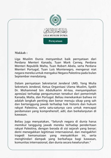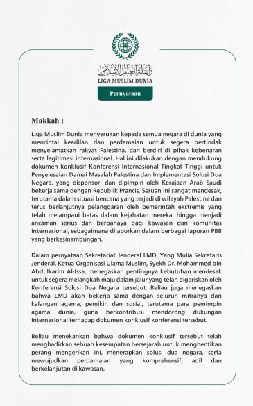 Liga Muslim Dunia menyampaikan belasungkawa dan simpati yang tulus kepada Amerika Serikat dan seluruh rakyatnya yang bersahabat, khususnya kepada keluarga para korban, atas insiden tabrakan antara pesawat penumpang dan helikopter militer di ibu kota, Washington. LMD juga mengungkapkan solidaritas dan empatinya kepada keluarga para korban atas kejadian tragis ini.