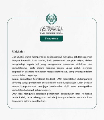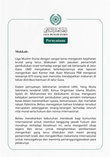 Dalam pernyataan Sekretariat Jenderal LMD, Yang Mulia Sekretaris Jenderal, Ketua Organisasi Ulama Muslim, Syekh Dr. Mohammed bin Abdulkarim Al-Issa, atas nama LMD, badan, dewan dan majelis internasionalnya, menegaskan dukungan penuh terhadap apa yang tercantum dalam pernyataan tersebut, mengenai hasil yang menjaga hak rakyat Palestina atas kebebasan dan martabat, kesatuan dan keselamatan wilayah Palestina yang diduduki, dalam kerangka solusi dua negara, dan untuk mencapai perdamaian dan stabilitas yang berkelanjutan di kawasan tersebut, dan mencegah pemerintah pendudukan israel dari praktik brutalnya terhadap mereka, dan pelanggaran berkelanjutan terhadap resolusi legitimasi internasional yang relevan dengan masalah mereka.