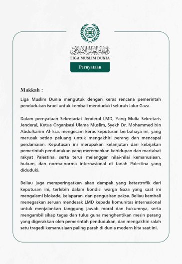 Dalam pernyataan Sekretariat Jenderal LMD, Yang Mulia Sekretaris Jenderal, Ketua Organisasi Ulama Muslim, Syekh Dr. Mohammed bin Abdulkarim Al-Issa, mengutuk tindakan brutal yang dilakukan oleh Pemerintah Pendudukan israel. Tindakan ini merupakan pelanggaran terhadap seluruh hukum serta norma internasional dan kemanusiaan, serta merupakan upaya sistematis untuk menggagalkan semua peluang penyelesaian dan upaya mencapai perdamaian yang adil dan komprehensif, yang dapat membawa keamanan dan stabilitas bagi kawasan dan dunia.