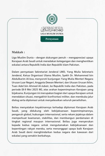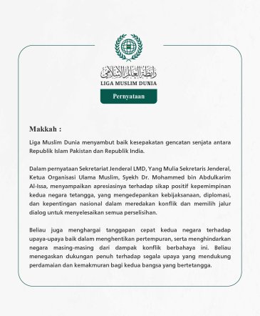 Liga Muslim Dunia menyambut baik dan memberikan apresiasi yang tinggi atas pengumuman Presiden Amerika Serikat