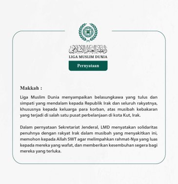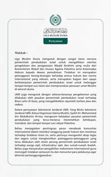 Dalam pernyataan Sekretariat Jenderal LMD, Yang Mulia Sekretaris Jenderal, Ketua Organisasi Ulama Muslim, Syekh Dr. Mohammed bin Abdulkarim Al-Issa, mengutuk kejahatan-kejahatan yang terus dilakukan oleh pasukan pemerintah pendudukan israel di Jalur Gaza. Beliau menekankan bahwa tindakan ini adalah pelanggaran terang-terangan terhadap semua hukum dan norma internasional serta kemanusiaan. Beliau juga menekankan pentingnya komunitas internasional untuk segera mengambil tanggung jawab hukum dan moral mereka dalam menghadapi genosida yang mengerikan ini, serta mengaktifkan mekanisme internasional untuk menghentikan dan mengadili para pelaku kejahatan tersebut.