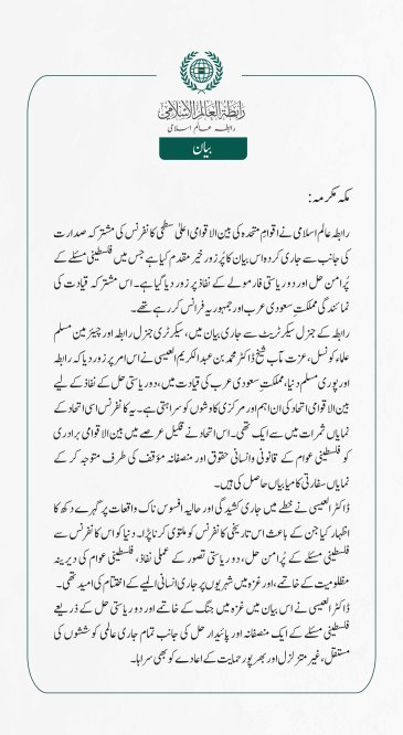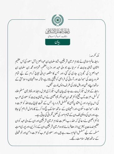 رابطہ عالم اسلامی نے اسلامی جمہوریہ پاکستان میں ہونے والے دہشت گردانہ واقعات کی سخت الفاظ میں مذمت کی ہے جن میں بھاری جانی نقصان ہوا ہے۔