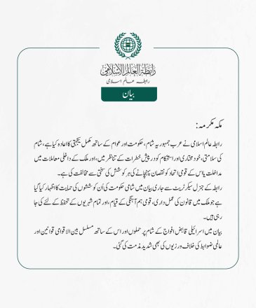 رابطہ عالم اسلامی نے قابض اسرائیلی حکومت کے اہلکار کی جانب سے مسجد اقصیٰ پر دھاوا بولنے اور اسرائیلی کنیسٹ کی طرف سے فلسطینی ریاست کے قیام کو مسترد کرنے کی قرارداد منظور کرنے کی سخت ترین الفاظ میں مذمت کی۔