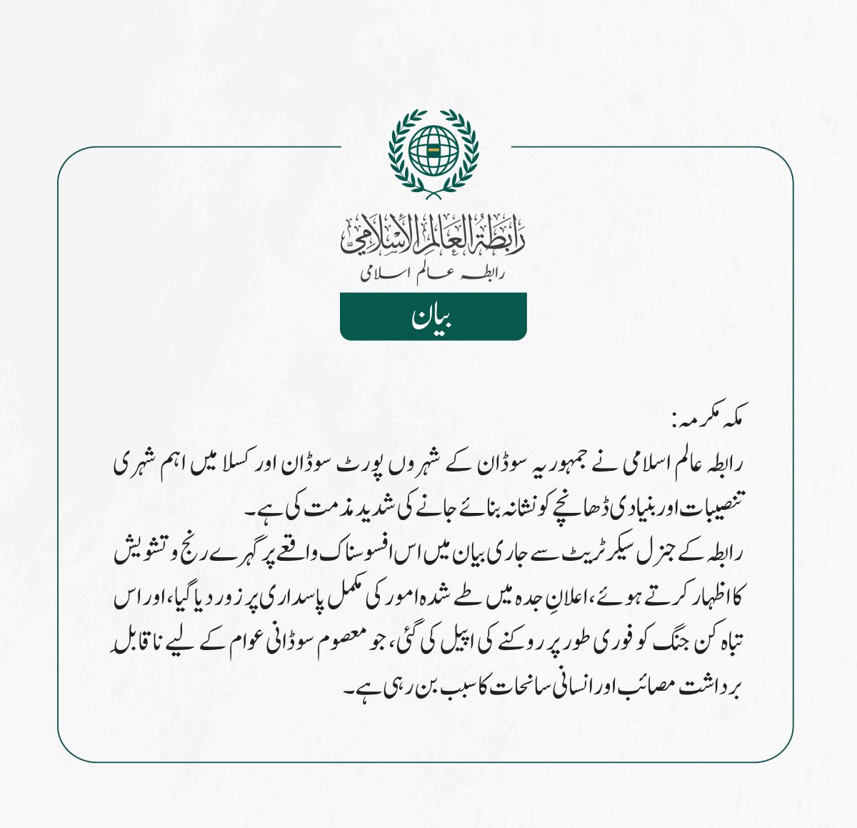 رابطہ عالم اسلامی نے جمہوریہ سوڈان کے شہروں پورٹ سوڈان اور کسلا میں اہم شہری تنصیبات اور بنیادی ڈھانچے کو نشانہ بنائے جانے کی شدید مذمت کی ہے۔