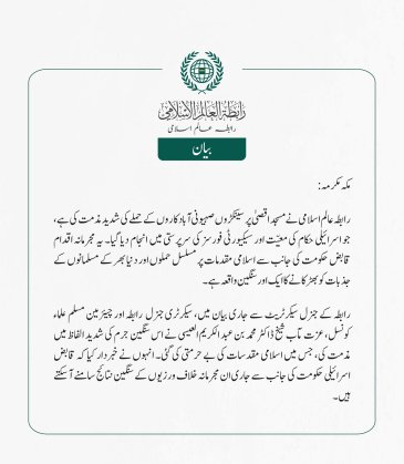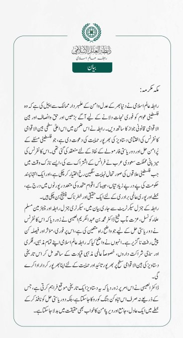رابطہ کے جنرل سیکرٹریٹ سے جاری بیان میں عراق کے عوام کے ساتھ اس دکھ کی گھڑی میں مکمل یکجہتی کا اظہار کرتے ہوئے دعا کی گئی ہے کہ اللہ تعالیٰ جاں بحق افراد کو اپنی جوارِ رحمت میں جگہ عطا فرمائے، اور زخمیوں کو جلد صحت یاب کرے۔