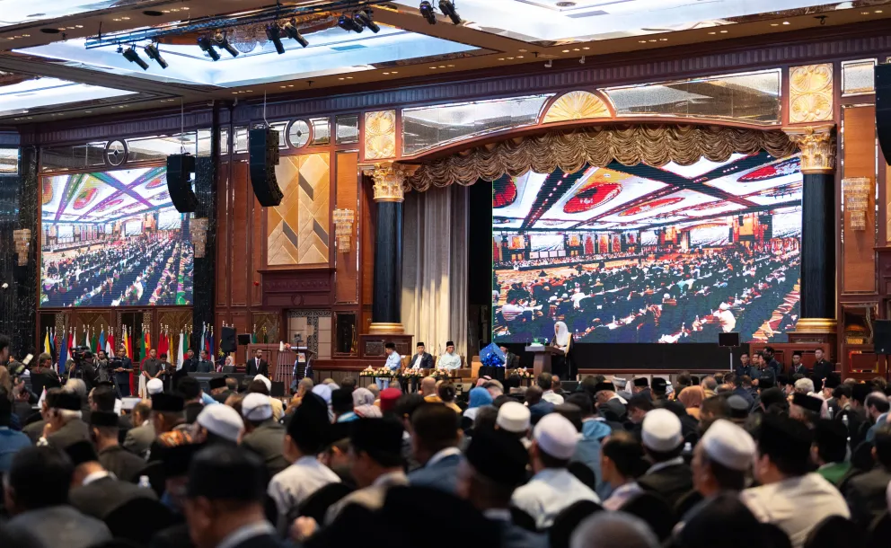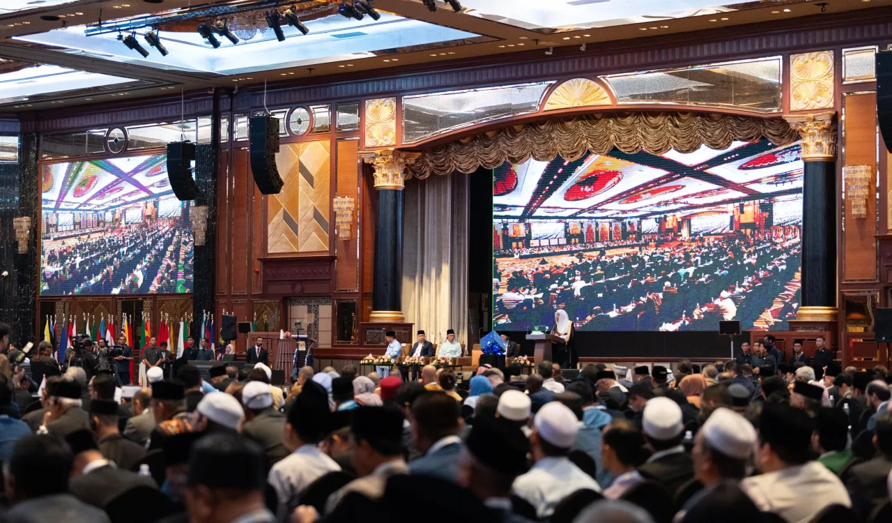 بحضور رئيس وزراء ماليزيا ونوابه ورئيس البرلمان وأعضاء الحكومة والبرلمان: شاهد .. لحظة وقوف أكثر من 2000 شخصية دينية دولية؛ تضامناً مع شهداء غزّة