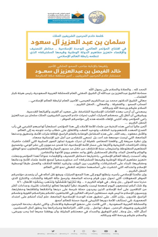 خادم الحرمين الشريفين يحفظه الله مخاطباً 1200 شخصية إسلامية من 127 دولة من كبار مفتيها وعلمائها…