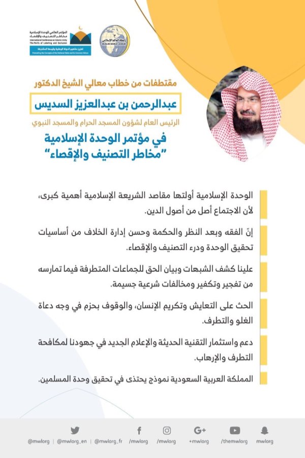 معالي الشيخ الدكتور عبدالرحمن بن عبد العزيز السديس مخاطباً 1200 شخصية إسلامية من 127 دولة يمثلون 28…