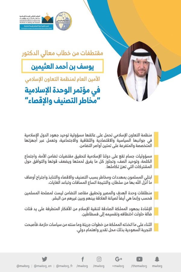 معالي د. يوسف العثيمين أمين عام منظمة التعاون الإسلامي مخاطباً 1200 شخصية إسلامية من 127 دولة يمثلون…