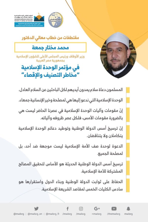 معالي أ.د محمد مختار جمعة وزير الأوقاف ورئيس المجلس الأعلى للشؤون الإسلامية بجمهورية مصر العربية مخاطباً…