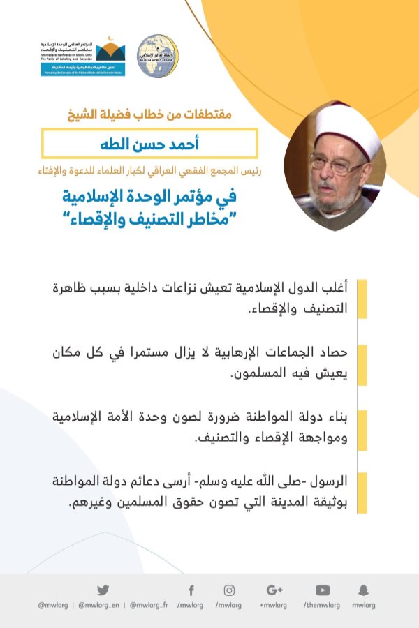 فضيلة رئيس مجلس علماء العراق الشيخ محمود بن عبد العزيز العاني، مخاطباً 1200 شخصية إسلامية من 127 دولة…
