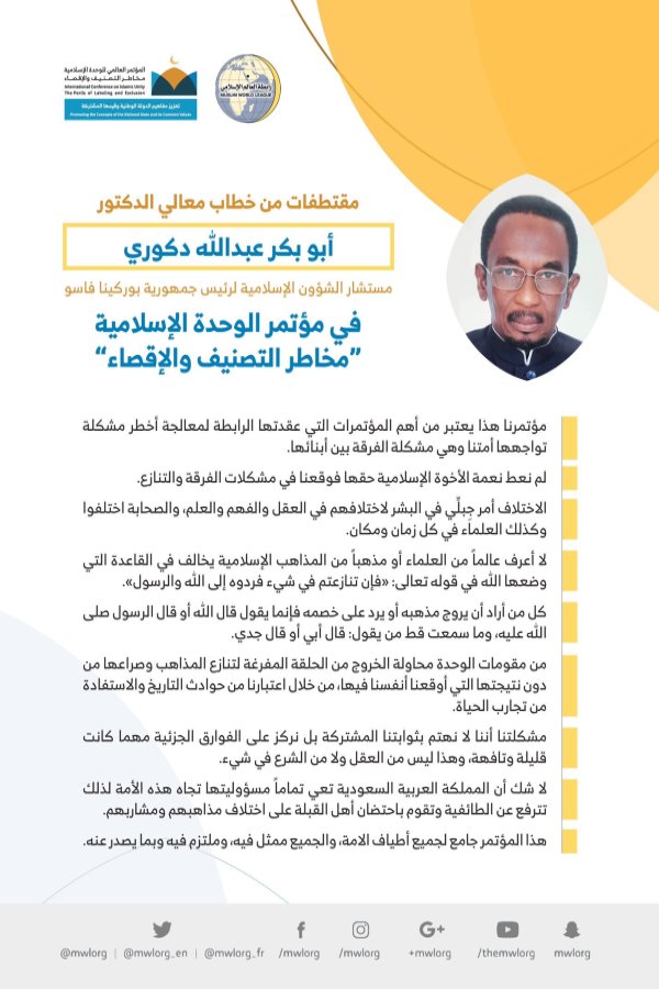 مستشار الشؤون الإسلامية لرئيس جمهورية بروكينا فاسو مخاطباً 1200 شخصية إسلامية من 127 دولة يمثلون 28…