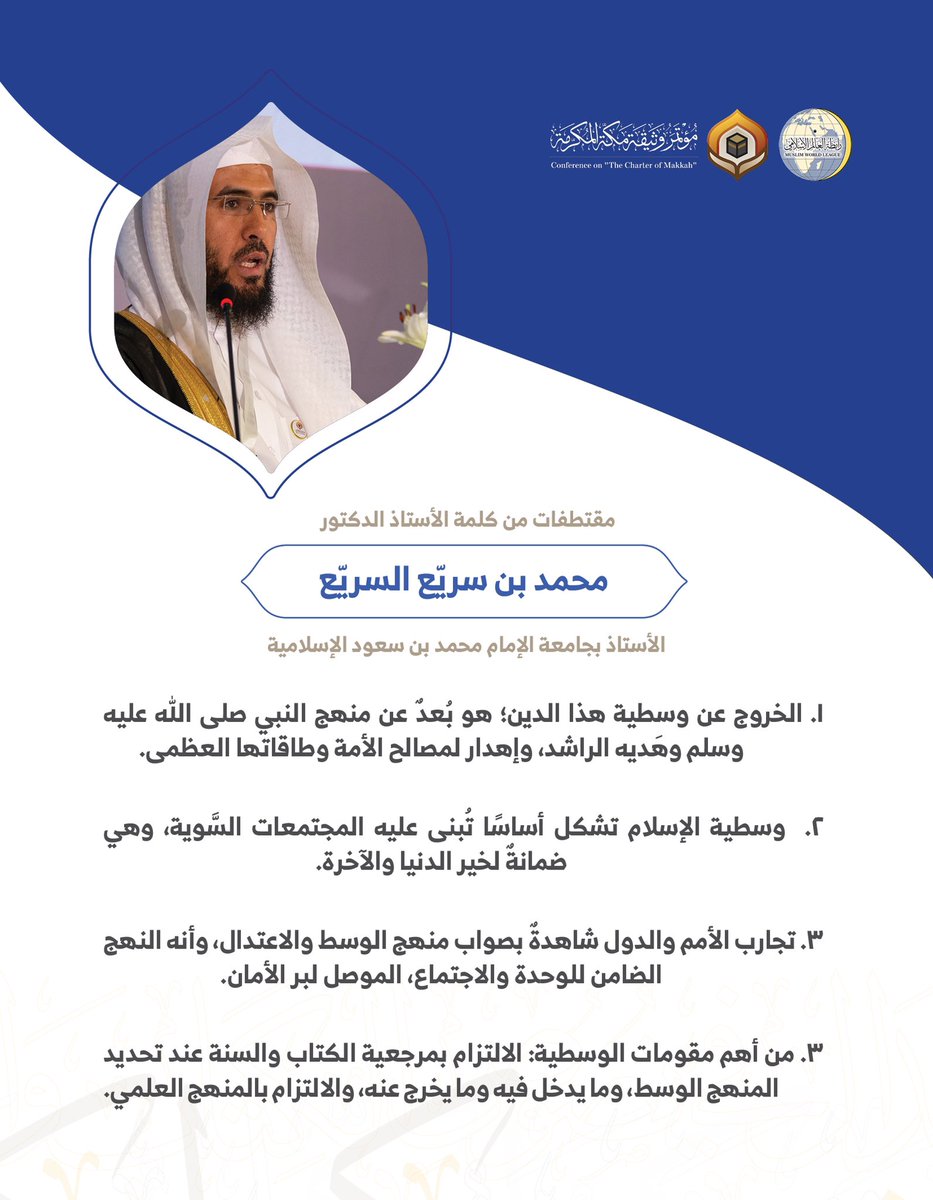 الأستاذ الدكتور محمد بن سريّع السريّع الأستاذ بجامعة الإمام محمد بن سعود الإسلامية مخاطباً 1200 شخصية إسلامية من 139 دولة في مؤتمر وثيقة مكة المكرمة: