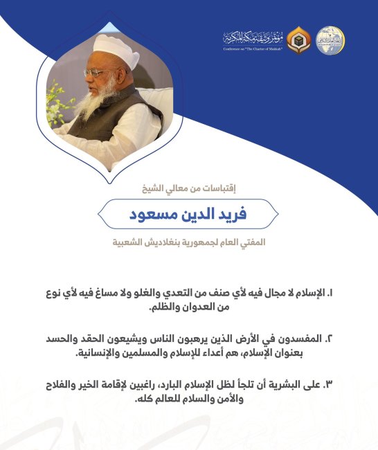 معالي الشيخ فريد الدين مسعود المفتي العام لجمهورية بنغلاديش الشعبية مخاطباً 1200 شخصية إسلامية من 139 دولة في مؤتمر وثيقة مكة المكرمة: