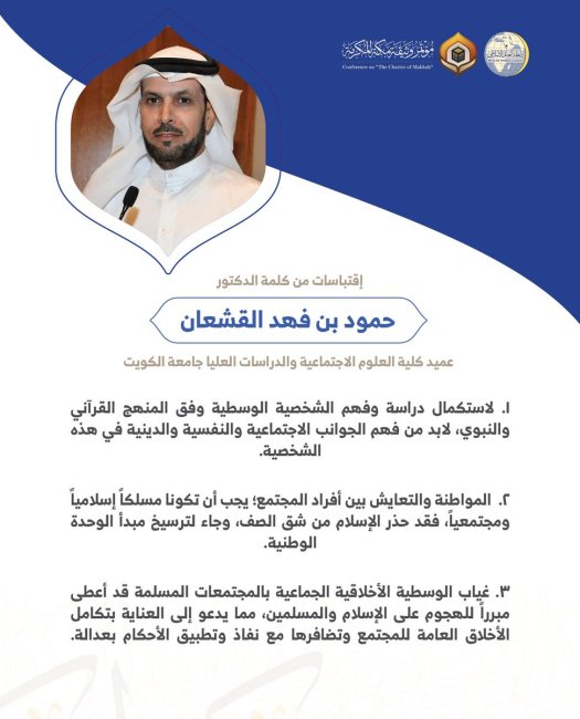 الدكتور حمود بن فهد القشعان عميد كلية العلوم الاجتماعية والدراسات العليا بجامعة الكويت مخاطباً 1200 شخصية إسلامية من 139 دولة في مؤتمر وثيقة مكة المكرمة: