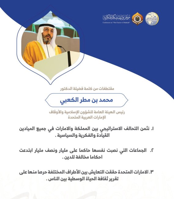 فضيلة الدكتور محمد بن مطر الكعبي رئيس الهيئة العامة للشؤون الإسلامية والأوقاف بالإمارات العربية المتحدة مخاطباً 1200 شخصية إسلامية من 139 دولة في مؤتمر وثيقة مكة المكرمة: