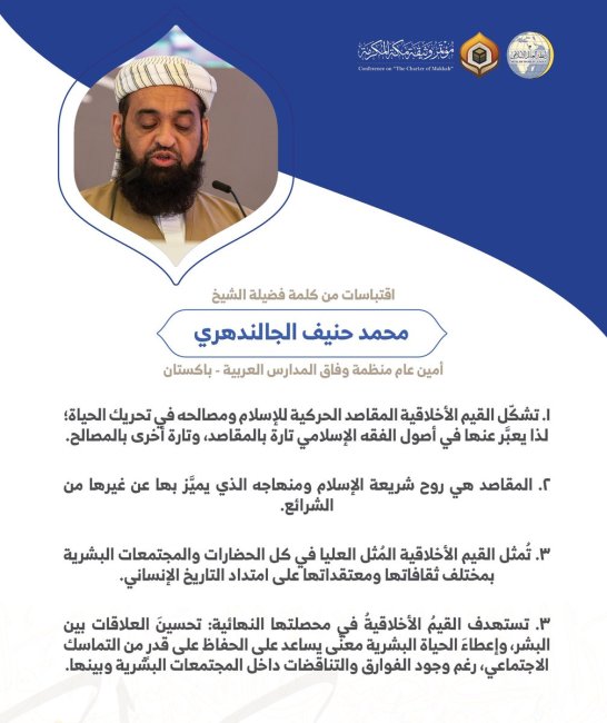 فضيلة الشيخ محمد حنيف الجالندهري أمين عام منظمة وفاق المدارس العربية بباكستان مخاطباً 1200 شخصية إسلامية من 139 دولة في مؤتمر وثيقة مكة المكرمة: