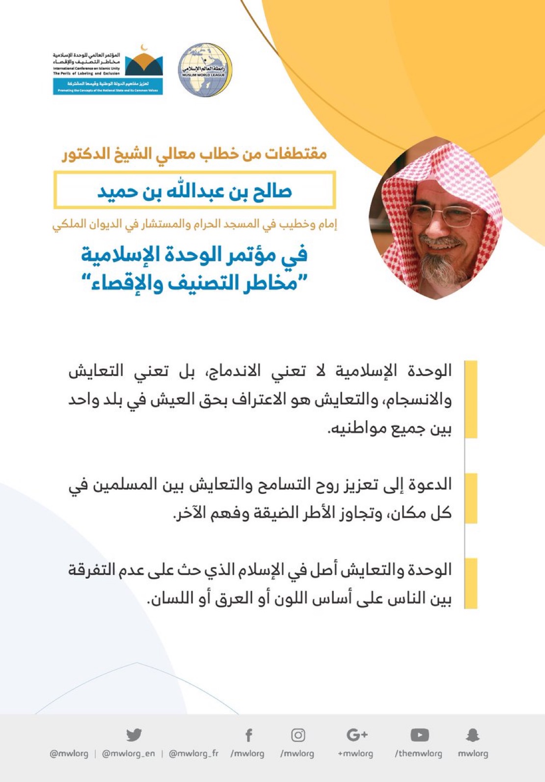 • الدعوة إلى تعزيز روح التسامح والتعايش بين المسلمين في كل مكان، وتجاوز الأطر الضيقة وفهم الآخر.