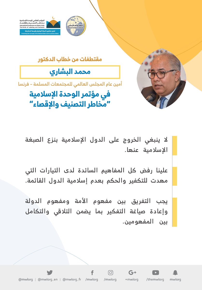 فضيلة الدكتور محمد البشاري مخاطباً 1200 شخصية إسلامية من 127 دولة يُمثلون 28 مكوِّناً إسلامياً في مؤتمر الرابطة :(الوحدة الإسلامية) المنعقد برعاية خادم الحرمين الشريفين في رحاب المسجد الحرام في مكة المكرمة:
