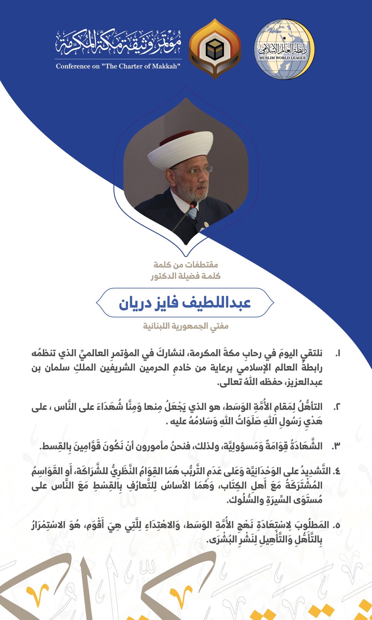 فضيلة مفتي جمهورية لبنان الشيخ د. عبداللطيف دريان مخاطباً 1200 شخصية إسلامية من 139 دولة في مؤتمر وثيقة مكة المكرمة: