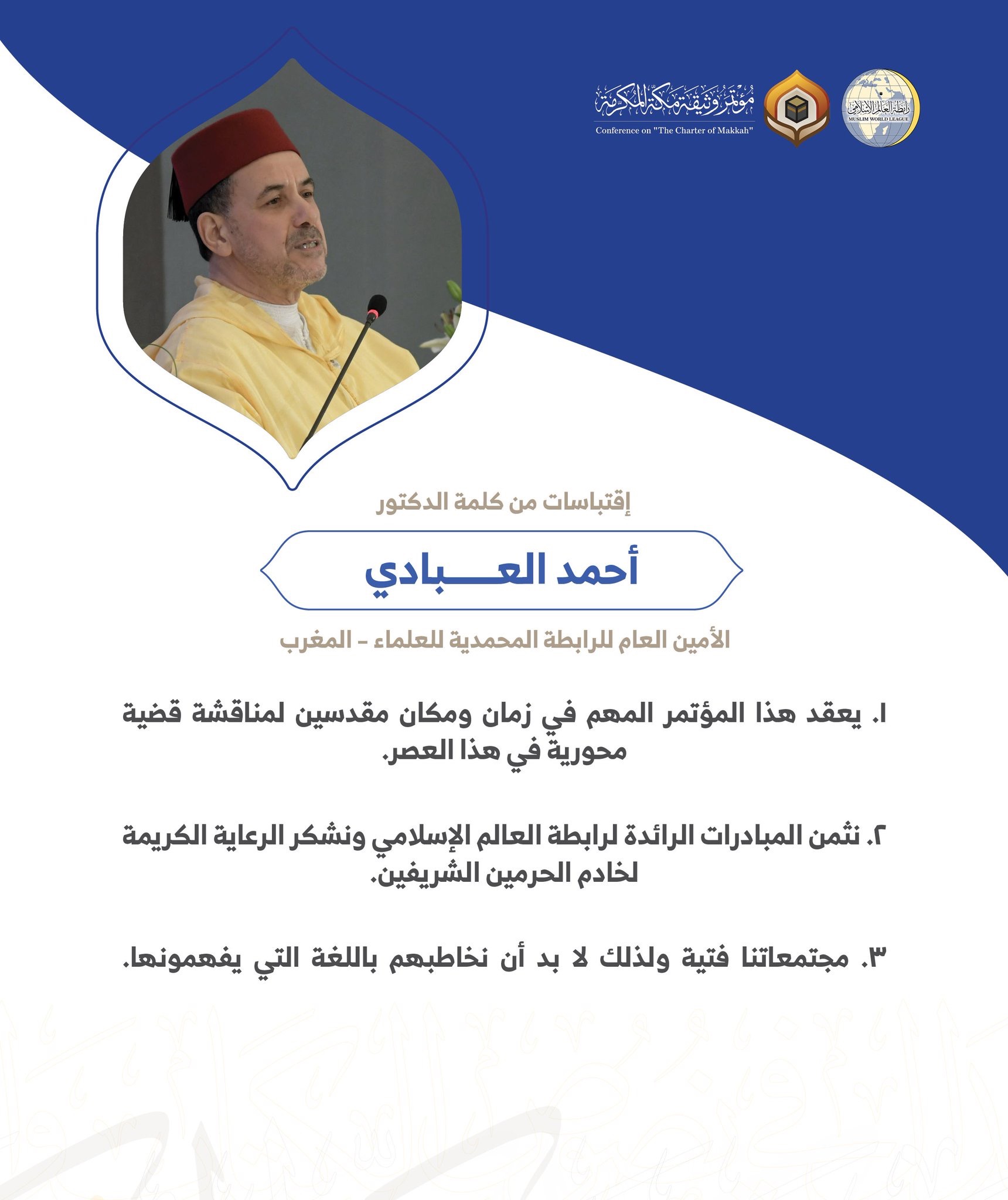 فضيلة الدكتور أحمد العبادي الأمين العام للرابطة المحمدية للعلماء بالمغرب مخاطباً 1200 شخصية إسلامية من 139 دولة في مؤتمر وثيقة مكة المكرمة: