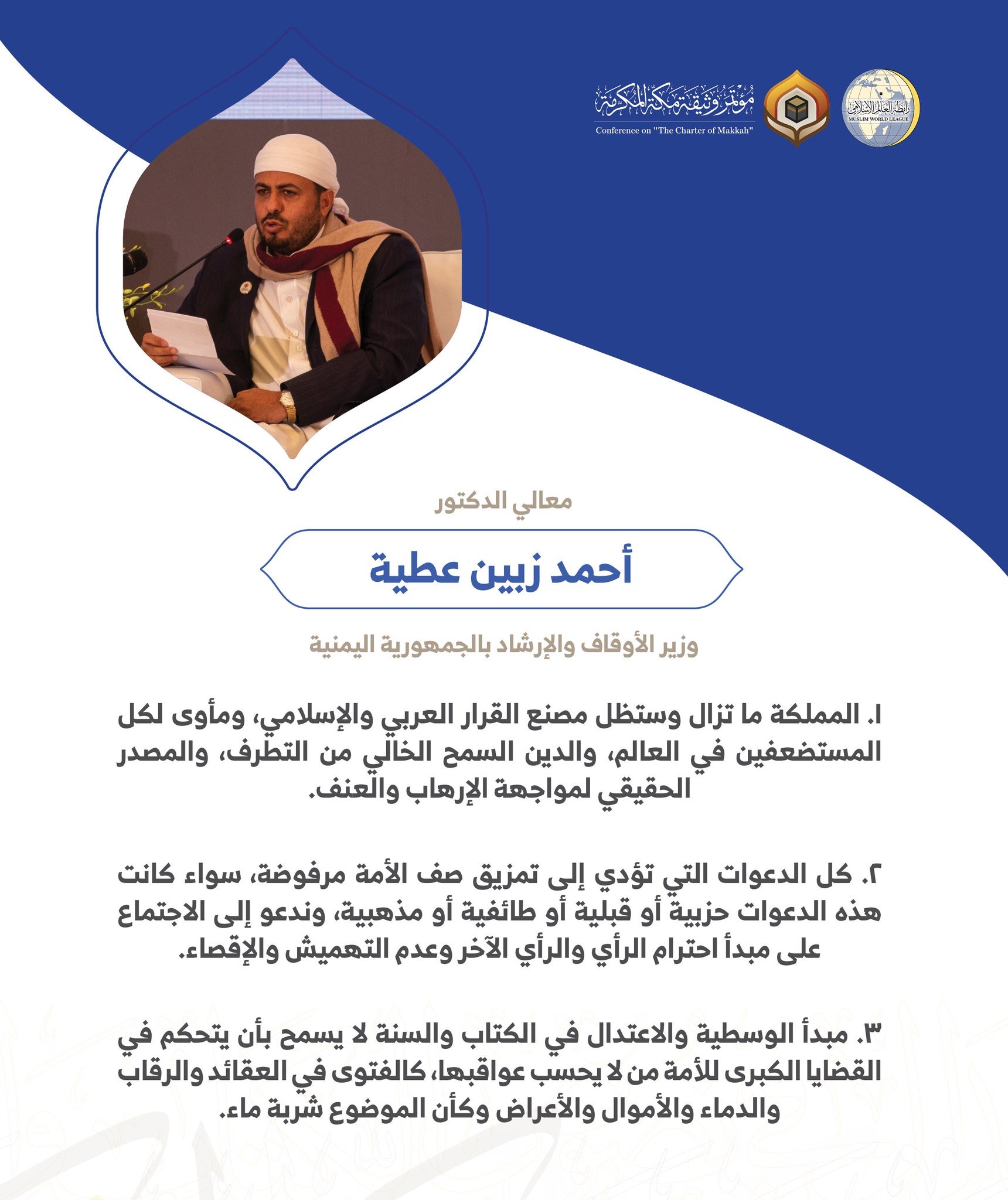 معالي الدكتور أحمد زبين عطية وزير الأوقاف والإرشاد بالجمهورية اليمنية مخاطباً 1200 شخصية إسلامية من 139 دولة في مؤتمر وثيقة مكة المكرمة:
