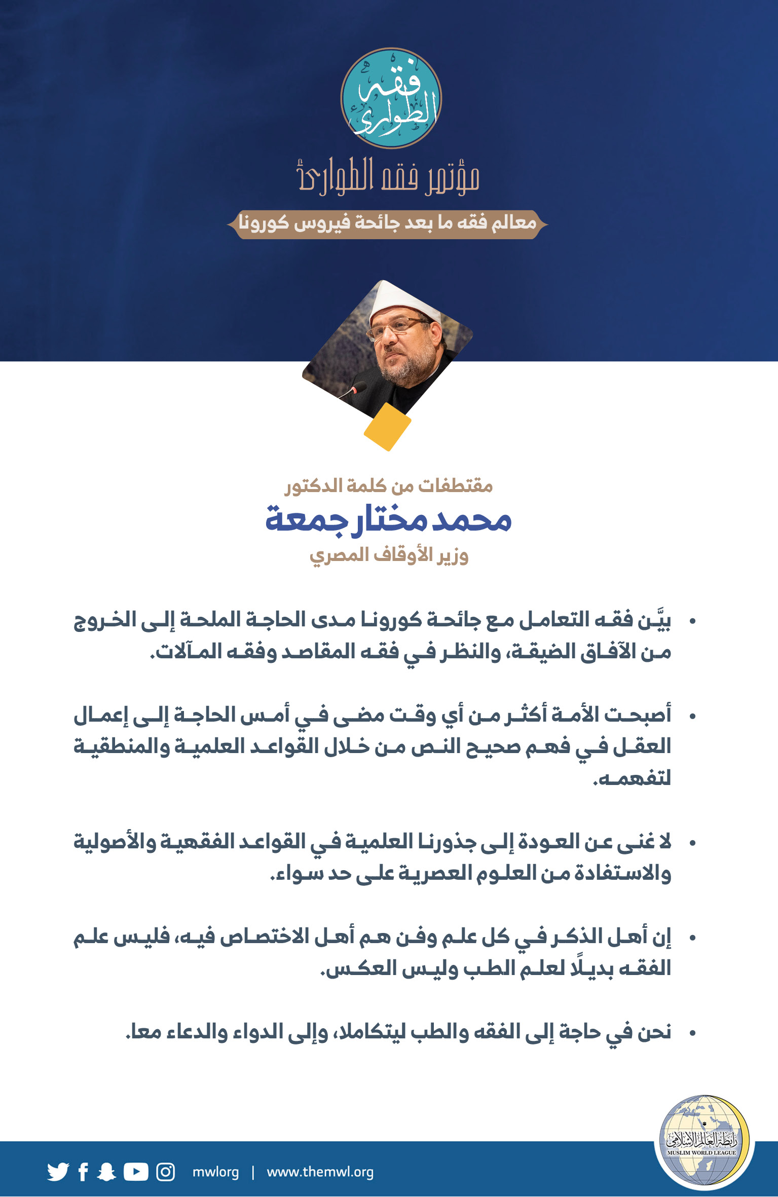 وزير الأوقاف المصري ، الدكتور محمد مختار جمعة في كلمته في الجلسة الافتتاحية لـ: مؤتمر فقه الطوارئ: