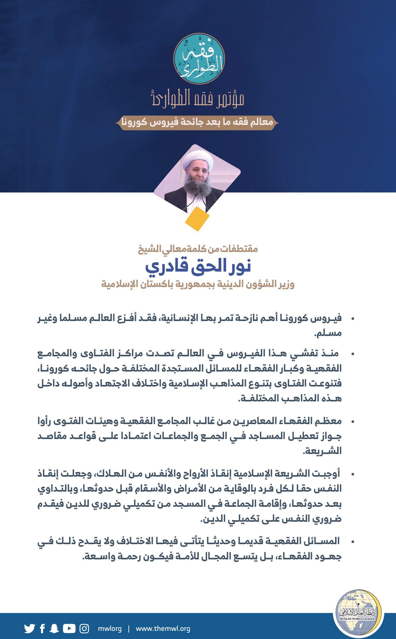 وزير الشؤون الدينية بجمهورية باكستان الإسلامية، معالي الشيخ نور الحق قادري في كلمته في الجلسة الافتتاحية لـ: مؤتمر فقه الطوارئ:
