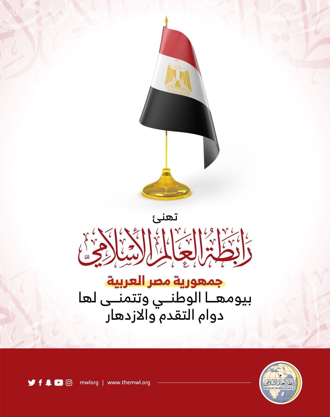 رابطة العالم الإسلامي تهنئ جمهورية مصر العربية بيومها الوطني.