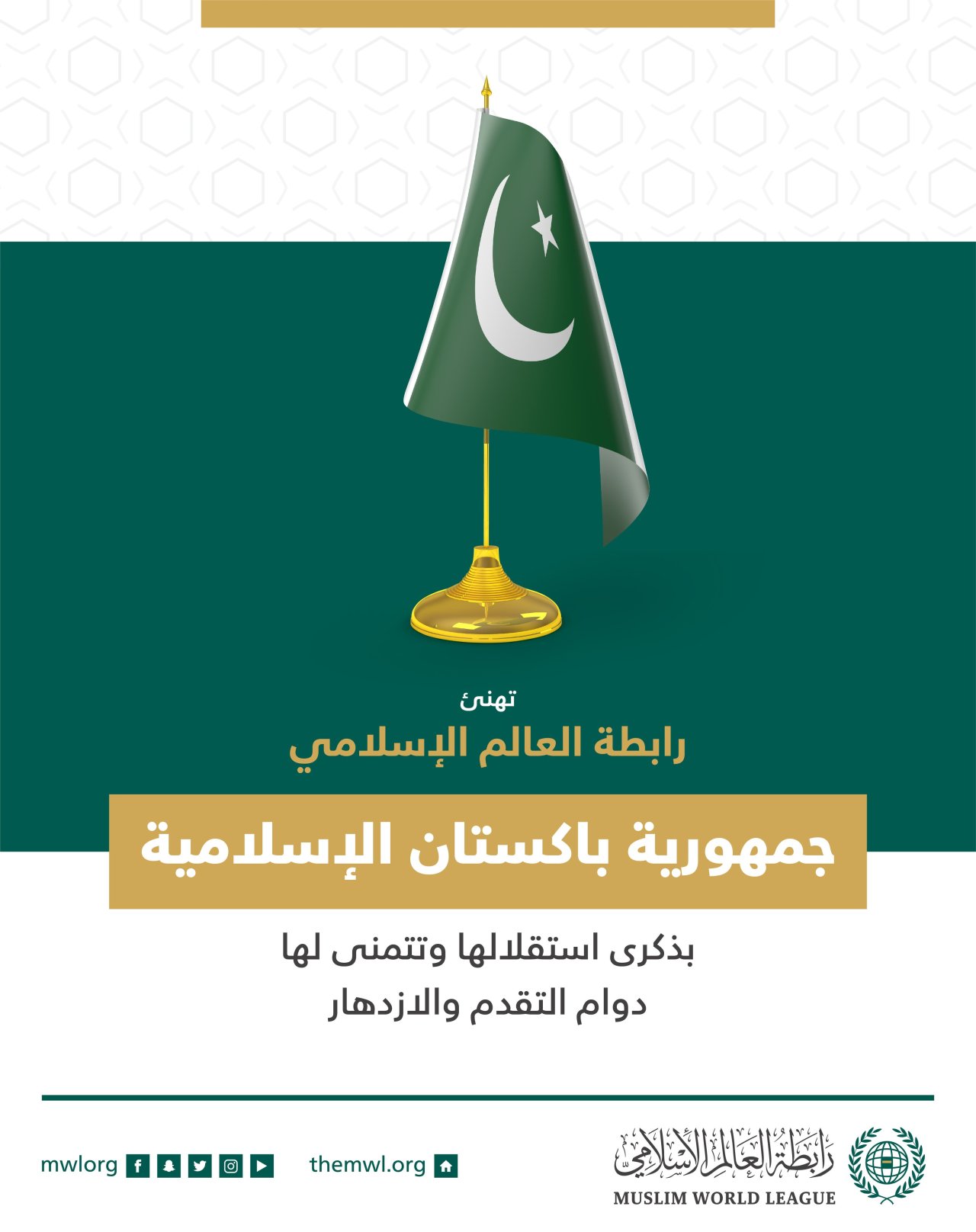 تهنئ رابطة العالم الإسلامي جمهورية باكستان الإسلامية بذكرى استقلالها، وتتمنى لها دوام التقدم والازدهار.