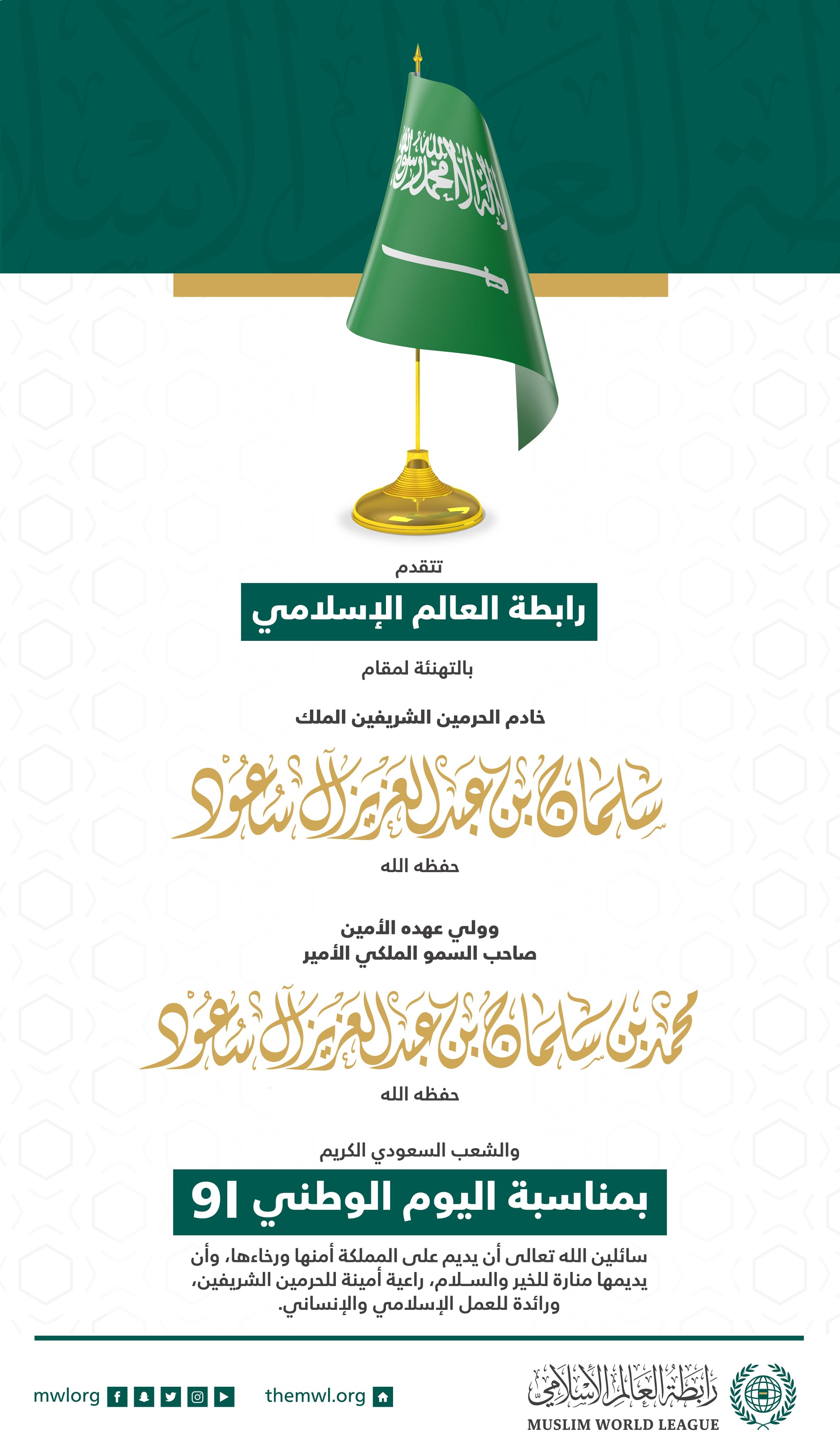 رابطة العالم الإسلامي تهنئ خادم الحرمين الشريفين وسمو ولي عهده الأمين "حفظهما الله"، والشعب السعودي النبيل بـ اليوم الوطني السعودي91 :