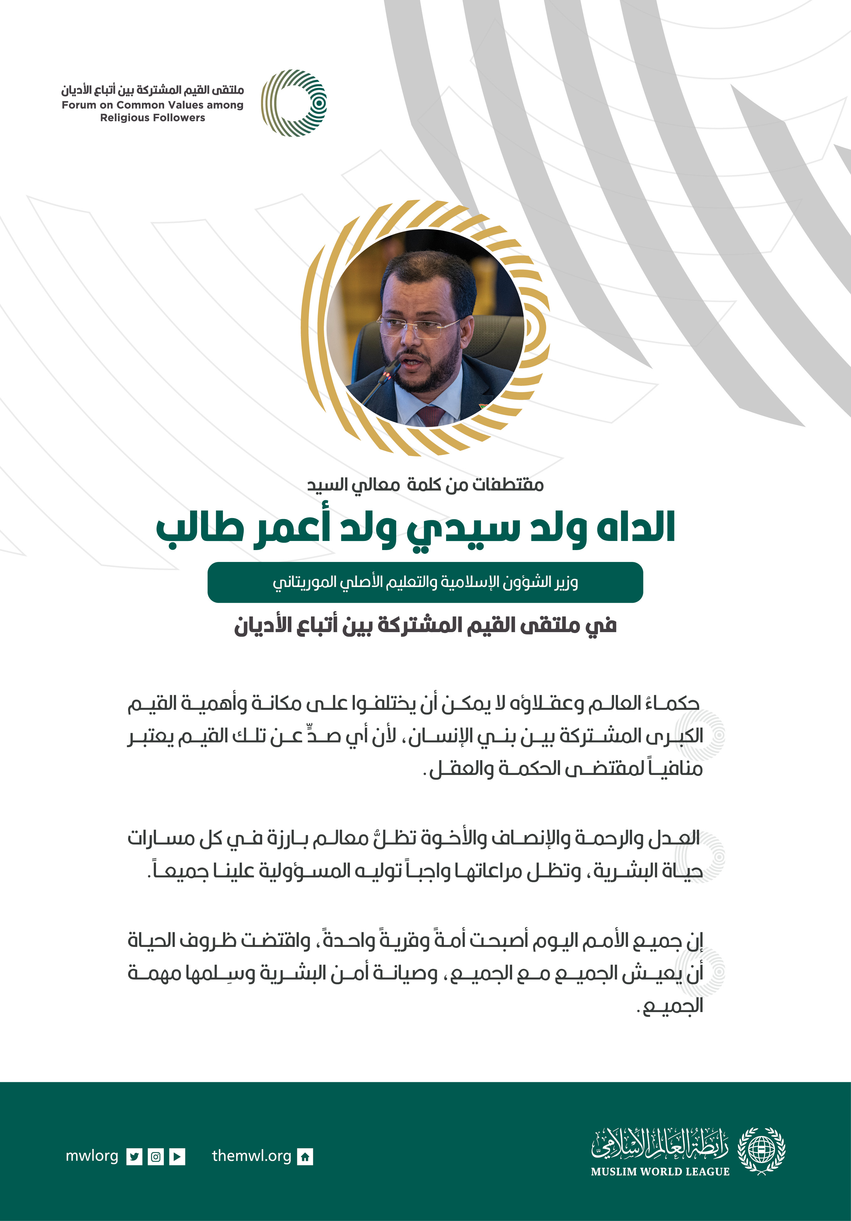 مقتطفات من كلمة وزير الشؤون الإسلامية والتعليم الأصلي الموريتاني، معالي السيد الداه ولد سيدي ولد أعمر طالب، خلال ملتقى القيم المشتركة بالرياض: