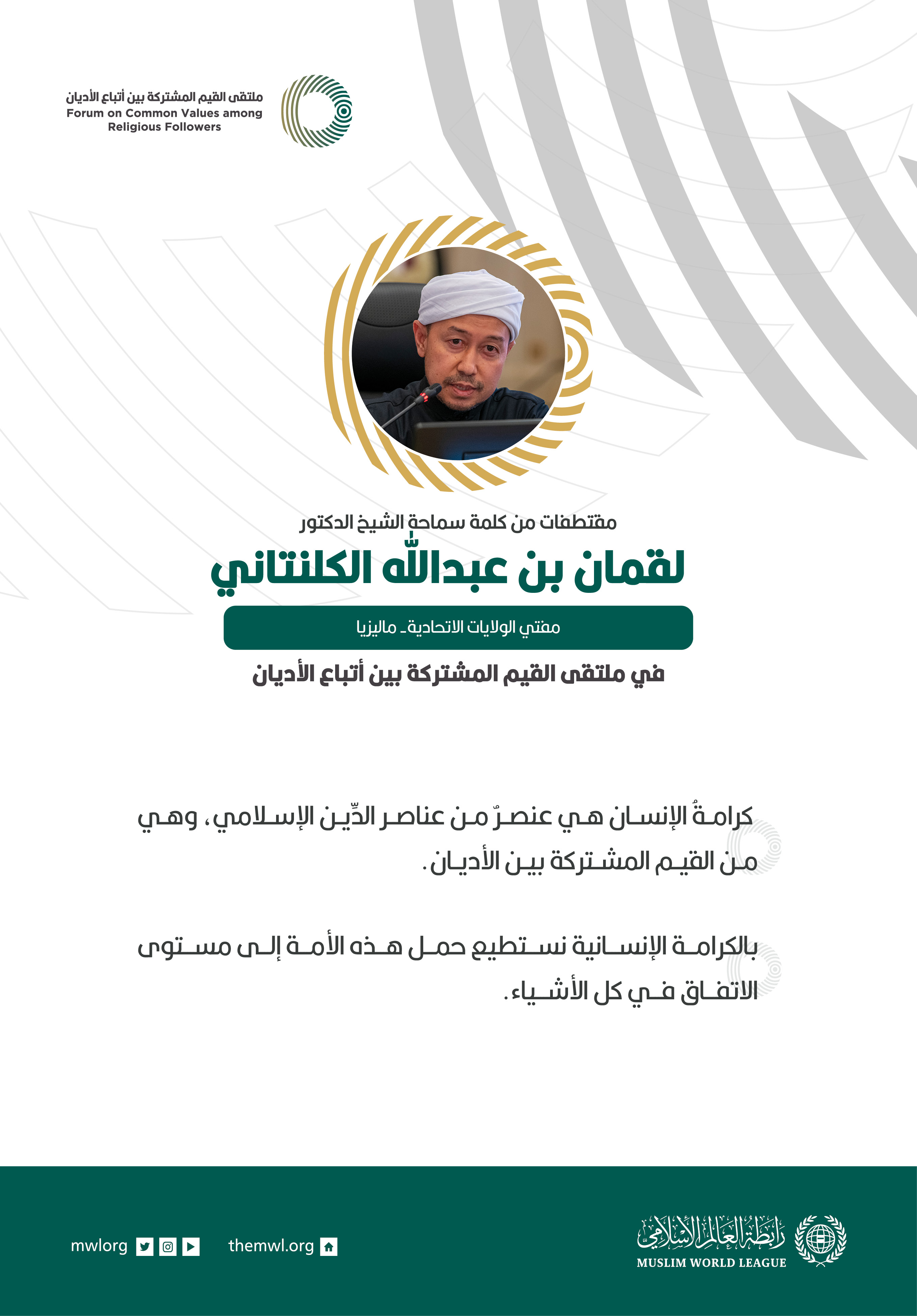مقتطفات من كلمة مفتي الولايات الاتحادية - ماليزيا، سماحة الشيخ الدكتور لقمان بن عبدالله الكلنتاني، خلال ملتقى القيم المشتركة بالرياض: