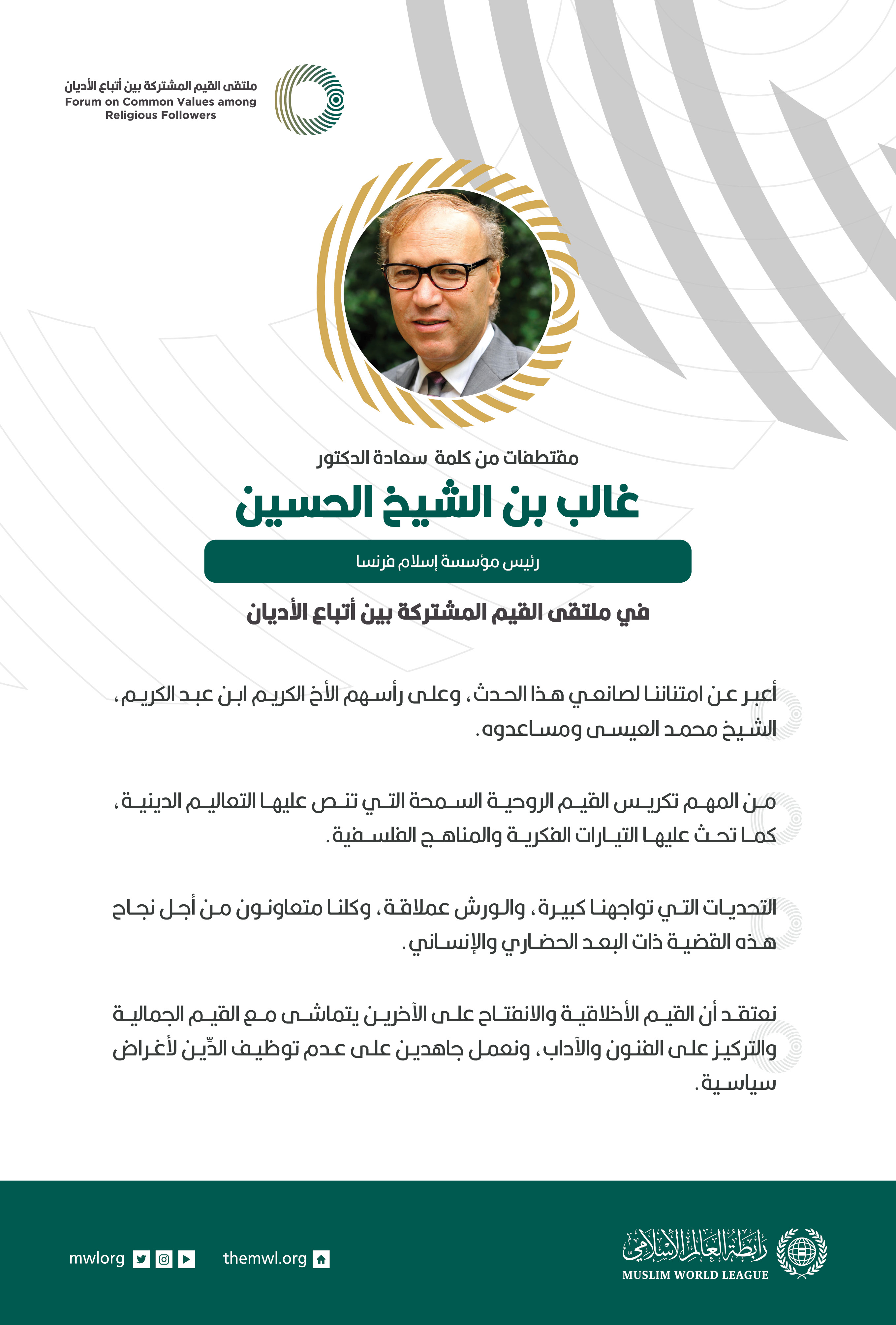 مقتطفات من كلمة رئيس مؤسسة إسلام فرنسا، سعادة الدكتور غالب بن الشيخ الحسين، خلال ملتقى القيم المشتركة بالرياض: