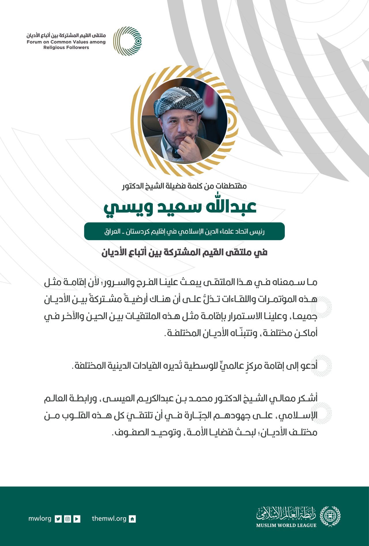 مقتطفات من كلمة رئيس اتحاد علماء الدين الإسلامي في إقليم كردستان - العراق، فضيلة الشيخ الدكتور عبدالله سعيد ويسي، خلال ملتقى القيم المشتركة بالرياض:
