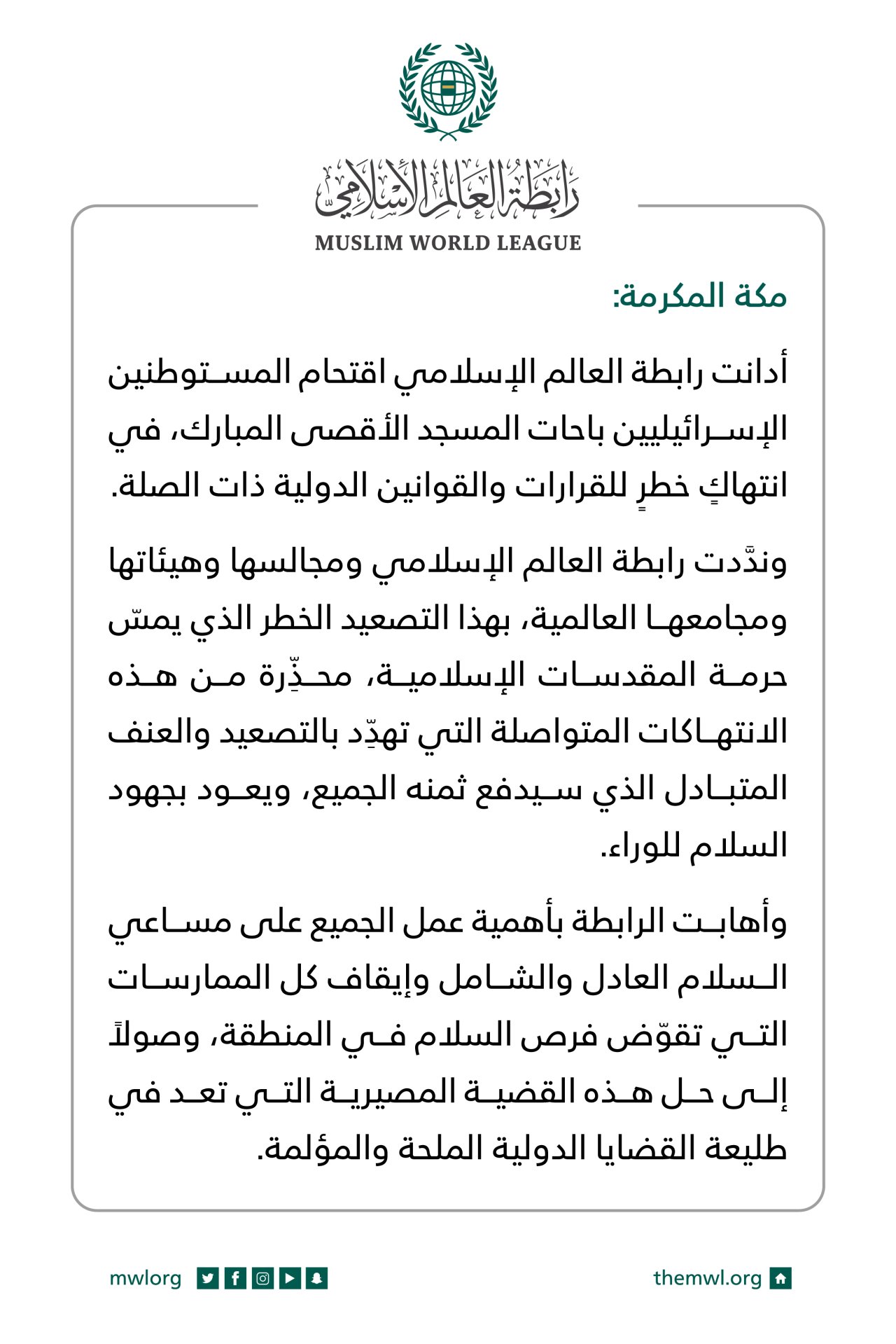 وندَّدت الرابطة ومجالسها وهيئاتها ومجامعها العالمية، بهذا التصعيد الخطر الذي يمسّ حرمة المقدسات الإسلامية، محذِّرة من هذه الانتهاكات المتواصلة التي تهدِّد بالتصعيد والعنف المتبادل الذي سيدفع ثمنه الجميع، ويعود بجهود السلام للوراء.