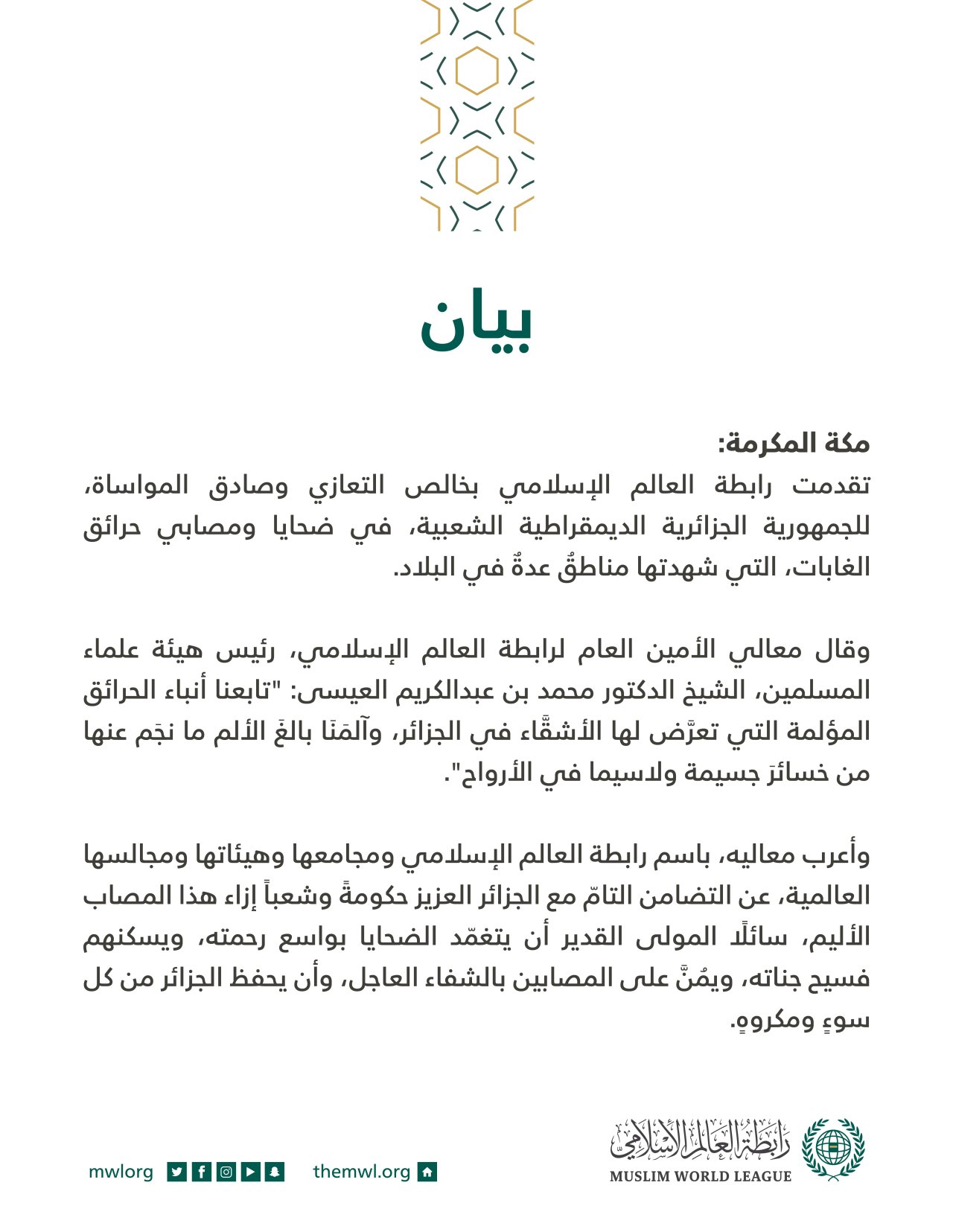 بيان من رابطة العالم الإسلامي الجمعة, 19 آب/أغسطس 2022 - 20:20